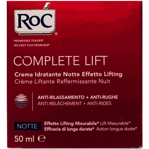 ROC ANTI ETA AA COMPLETE LIFT NOTTE Rughe KO! Crema ultra-idratante che riduce i segni dell'invecchiamento. Stimola la produzione di elestina e ristruttura la tua pelle, notte dopo notte. Al risveglio la pelle appare piu' giovane e levigata. Modalita' d'impiego: Applicare alla sera su viso e collo perfettamente detersi. Confezione: Vasetto da 50ml [EAN: 3574660475074]