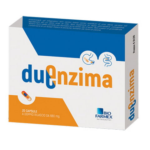 DUENZIMA Descrizione Integratore alimentare di enzimi digestivi. Ingredienti Lipasi, amilasi, glucoamilasi, alfa-galattosidasi, proteasi 3.0, proteasi 6.0, proteasi neutre, proteasi 4.5. olio di girasole, gelatina, biossido di titanio, ossido di ferro, idrossipropilmeticellulosa, gomma di gellano. Caratteristiche nutrizionali Ingredienti per 1 capsula Capsula esterna Capsula interna Totale Lipasi 13,3 mg (4.000 FIP) 45,5 mg (9.000 FIP) 58,8 mg (13.000 FIP) Amilasi 21,5 mg (2.150 DU) 30 mg (4.500 DU) 51,5 mg (6.650 DU) Glucoamilasi 13,8 mg (14 AGU) 26,7 mg (12 AGU) 40,5 mg (26 AGU) Alfa-galattosidasi - 12,5 mg (125 GaIU) 12,5 mg (125 GaIU) Proteasi 4.5 3,9 mg (3.120 HUT) 1,7 mg (1.000 HUT) 5,6 mg (4.120 HUT) Proteasi 3.0 7,5 mg (15 SAPU) - 7,5 mg (15 SAPU) Proteasi 6.0 - 6 mg (3.000 HUT) 6 mg (3.000 HUT) Proteasi batteriche neutre - 4 mg (3.000 PC) 4 mg (3.000 PC) Modalit? d'uso Assumere 1-2 capsule prima dei pasti principali. Avvertenze Gli integratori non vanno intesi come sostituti di una dieta variata ed equilibrata ed un sano stile di vita. Non superare la dose giornaliera consigliata. Tenere fuori dalla portata dei bambini al di sotto 3 anni. In gravidanza e allattamento assumere sotto il controllo del medico. Conservazione Conservare in luogo fresco e asciutto, lontano da fonti di calore. Validit? a confezionamento integro: 24 mesi. Formato Confezione contenente 20 capsule a doppio rilascio da 680 mg. Peso netto: 13,6 g