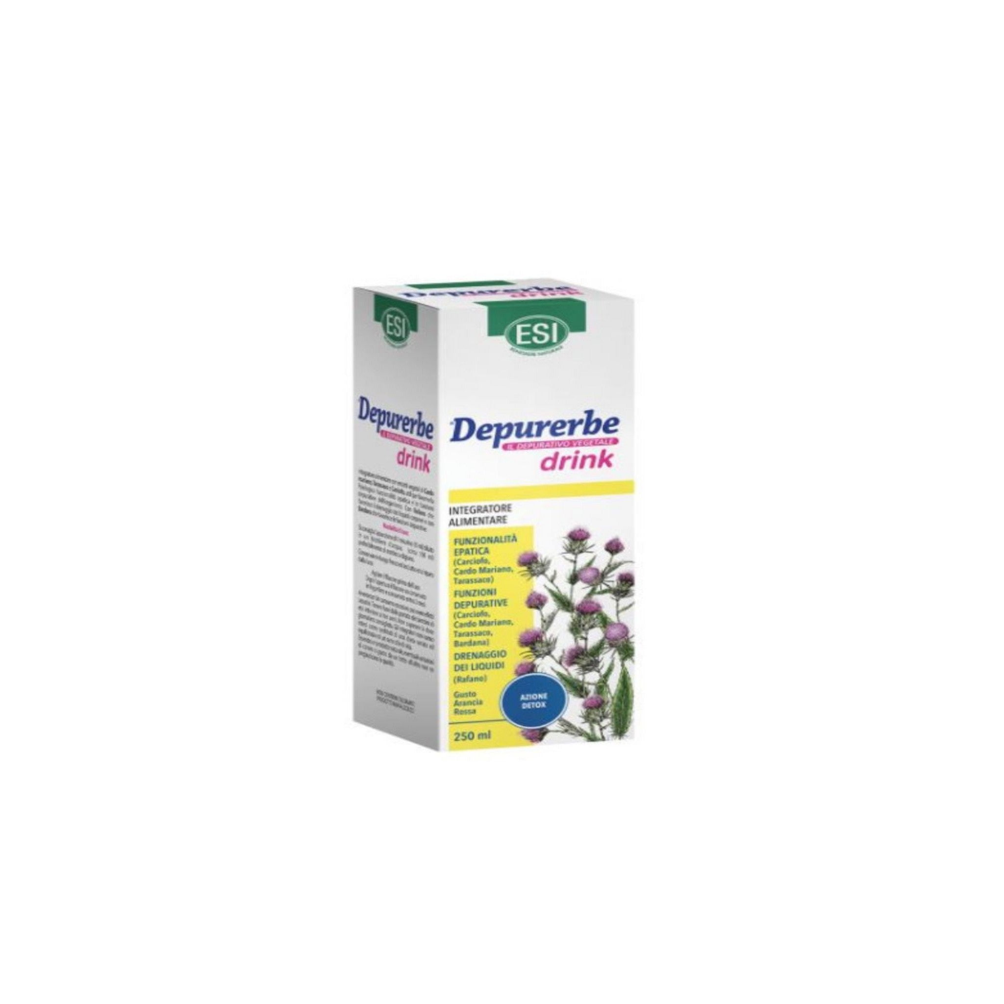 Esi DepurErbe Drink è un integratore alimentare con estratti vegetali di Cardo mariano, Tarassaco e Carciofo, utili per favorire la fisiologica funzionalità epatica e le funzioni depurative dell’organismo. Con Rafano che favorisce il drenaggio dei liquidi corporei. Con Bardana che contribuisce alle funzioni depurative.
