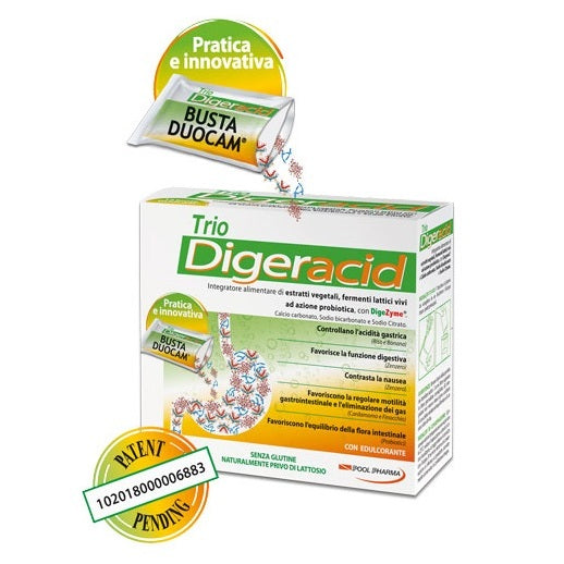 Trio Digeracid Descrizione Integratore alimentare a base di riso, banana, curcuma longa, zenzero e probiotici con DigeZyme, complesso enzimatico (alfa-amilasi, proteasi, lattasi, cellulasi, lipasi) da substrato vegetale fermentato, indicato in caso di mancato fabbisogno o ridotto apporto con la dieta dei nutrienti in esso contenuti. La speciale tecnologia Duocam rende possibile la compresenza nella stessa bustina di fermenti lattici probiotici, che favoriscono l'equilibrio della ora batterica intestinale, enzimi ed estratti vegetali, utili per i loro effetti sulla funzione digestiva (Zenzero), per il controllo dell'acidit? gastrica (Banana e riso) e antinausea (Zenzero). Gli olii essenziali di finocchio e cardamomo favoriscono l'eliminazione dei gas intestinali e una regolare motilit? gastrointestinale. Ingredienti Camera fermenti: maltodestrine; Bifidobacterium lactis HN019 (ATCC: SD5674); agente antiagglomerante: biossido di silicio; Lactobacillus acidophilus NCFM (ATCC: SD5221). Camera estratti: correttori di acidit?: carbonato acido di sodio, acido citrico, carbonato di calcio, citrato trisodico; aromi, farina di riso (Oryza sativa L., semen), banana (Musa Paradisiaca L. var., fructus) polvere; Enzi-Mix R-[Complesso enzimatico (alfa-amilasi, proteasi, lattasi, cellulasi, lipasi] da substrato vegetale fermentato), curcuma (Curcuma longa L., rhizoma) e.s., zenzero (Zingiber officinale Rosc., rizhoma) e.s.; edulcorante: sucralosio; maltodestrine; agente antiagglomerante: biossido di silicio; finocchio (Foeniculum vulgare Mill., aetheroleum) o.e., cardamomo [Elettaria cardamomum (L.) Maton, aetheroleum] o.e. Senza glutine. Naturalmente privo di lattosio. Caratteristiche nutrizionali Valori medi per 1 bustina Bi dobacterium lactis 1 miliardo UFC* Lactobacillus acidophilus 0,10 miliardi UFC* Farina di riso 50 mg Banana in polvere 50 mg Curcuma e.s. 25 mg Zenzero e.s. 15 mg DigeZyme 40 mg Finocchio o.e. 2 mg Cardamomo o.e. 2 mg *UFC: Unit? Formanti Colonie. Modalit? d'uso Sciogliere il contenuto della busta in un bicchiere d'acqua e bere la sospensione ottenuta, prima o dopo ogni pasto principale. Avvertenze Tenere fuori dalla portata dei bambini sotto i 3 anni. Non superare la dose giornaliera consigliata. Gli integratori non vanno intesi come sostituti di una dieta variata ed equilibrata e di un sano stile di vita. In caso di alterazioni della funzione epatica, biliare o di calcolosi delle vie biliari, l'uso del prodotto ? sconsigliato. Se si stanno assumendo farmaci, ? opportuno sentire il parere del medico. Il prodotto Trio Digeracid non contiene sostanze controindicate in gravidanza e allattamento. Conservazione Conservare ad una temperatura non superiore ai 25?C; evitare l'esposizione a fonti di calore localizzate, ai raggi solari e il contatto con l'acqua. Il termine minimo di conservazione si riferisce al prodotto correttamente conservato, in confezione integra. Formato Confezione da 12 bustine. Cod. TRI0AAC00100 [EAN: 8057741840442]