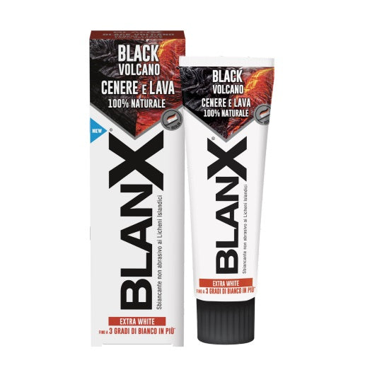 • Grazie alla proprietà purificanti e assorbenti di Cenere, Lava Vulcanica e Carbone 100% Naturali, BlanX Black Volcano ha un'azione sbiancante potenziata, senza effetto abrasivo sullo smalto.