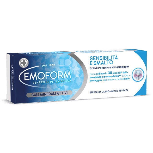 La speciale formulazione di Emoform Sensibilità e Smalto è ricca di:- SALI DI POTASSIO: minerali che forniscono sollievo immediato dalla sensibilità dentale*