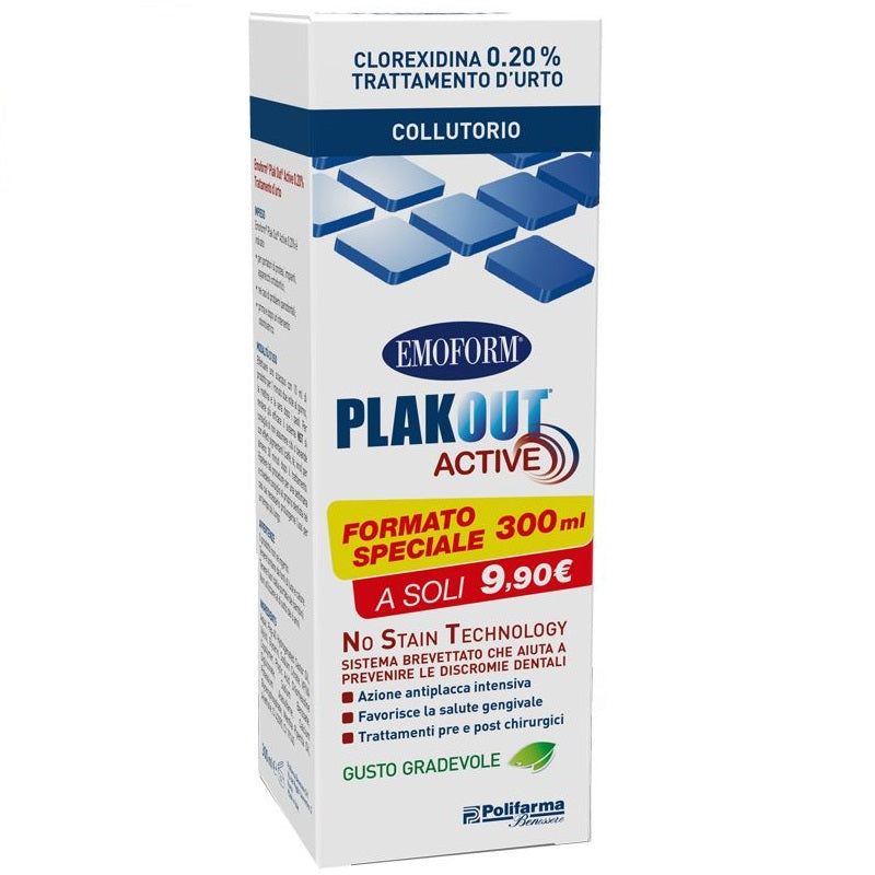 • Il collutorio Emoform Plakout Active 0,20% con il sistema antimacchia brevettato NO STAIN TECHNOLOGY è indicato in tutti i casi di trattamento d’urto per un’azione antiplacca intensiva.