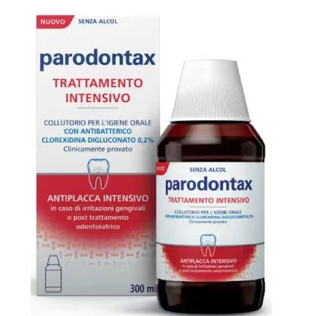 - Il colluttorio parodontax trattamento intensivo con antibatterico e' un antiplacca intensivo particolarmente utile in caso di irritazioni gengivali causate da un’eccessiva formazione di placca batterica