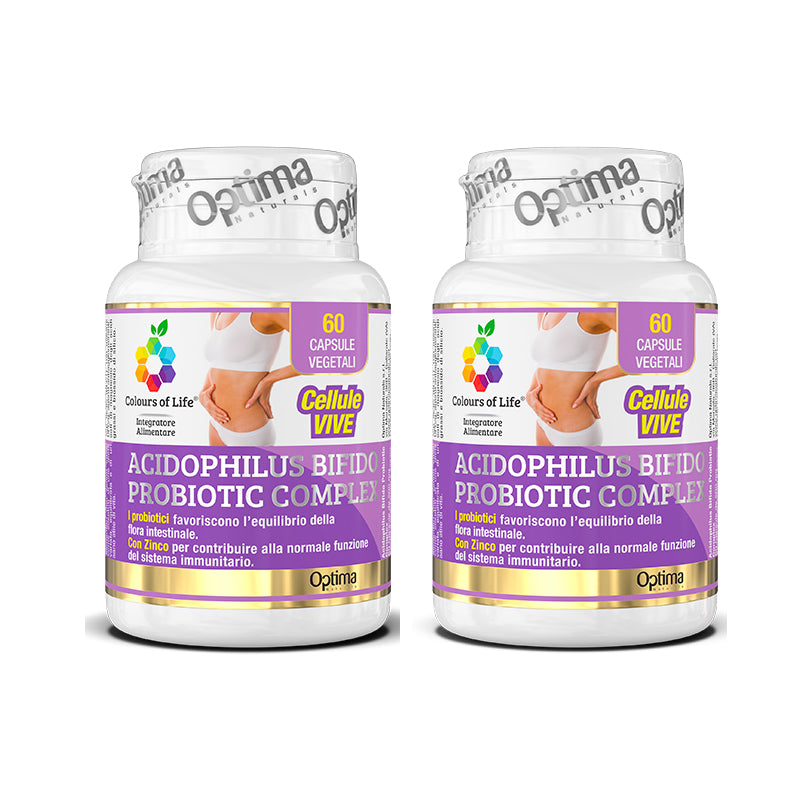 COLOURS OF LIFE ACIDOPHILUS BIFIDO PROBIOTIC COMPLEXFormato:Confezione bi-pacco 60+60 capsule.I probiotici favoriscono l’equilibrio della flora intestinale. Con Zinco per contribuire alla normale funzione del sistema immunitario. Il Lactobacillus Acidophilus rappresenta il principale probiotico autoctono che colonizza il primo tratto intestinale, duodeno e digiuno. Diversi studi hanno evidenziato che Lactobacillus Acidophilus E' caratterizzato dalla capacità di inibire la crescita batterica e fungina, costituendo un utile sistema di difesa fisiologico in caso di infezioni da diversi batteri e miceti patogeni, in particolare la Candida Albincans.