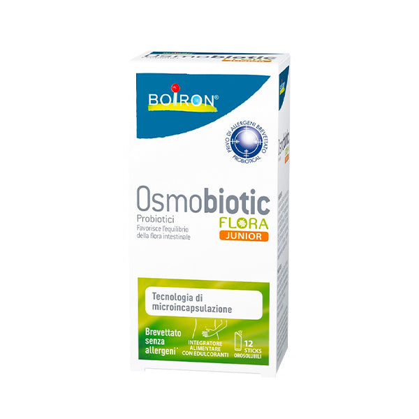 Boiron Osmobiotic Flora Junior è un integratore a base di probiotici selezionati e documentati, adatto per il benessere dell'intestino dei bambini dai 3 anni di età. Osmobiotic Flora Junior è realizzato con una nuova tecnologia di microincapsulazione singola per ogni ceppo probiotico che li protegge dall'acidità gastrica: questa ulteriore protezione dei probiotici consente che l'intestino sia raggiunto da un maggior numero di ceppi probiotici ed abbia così una maggiore efficacia. Gli stick di Osmobiotic hanno un aroma naturale di lampone.