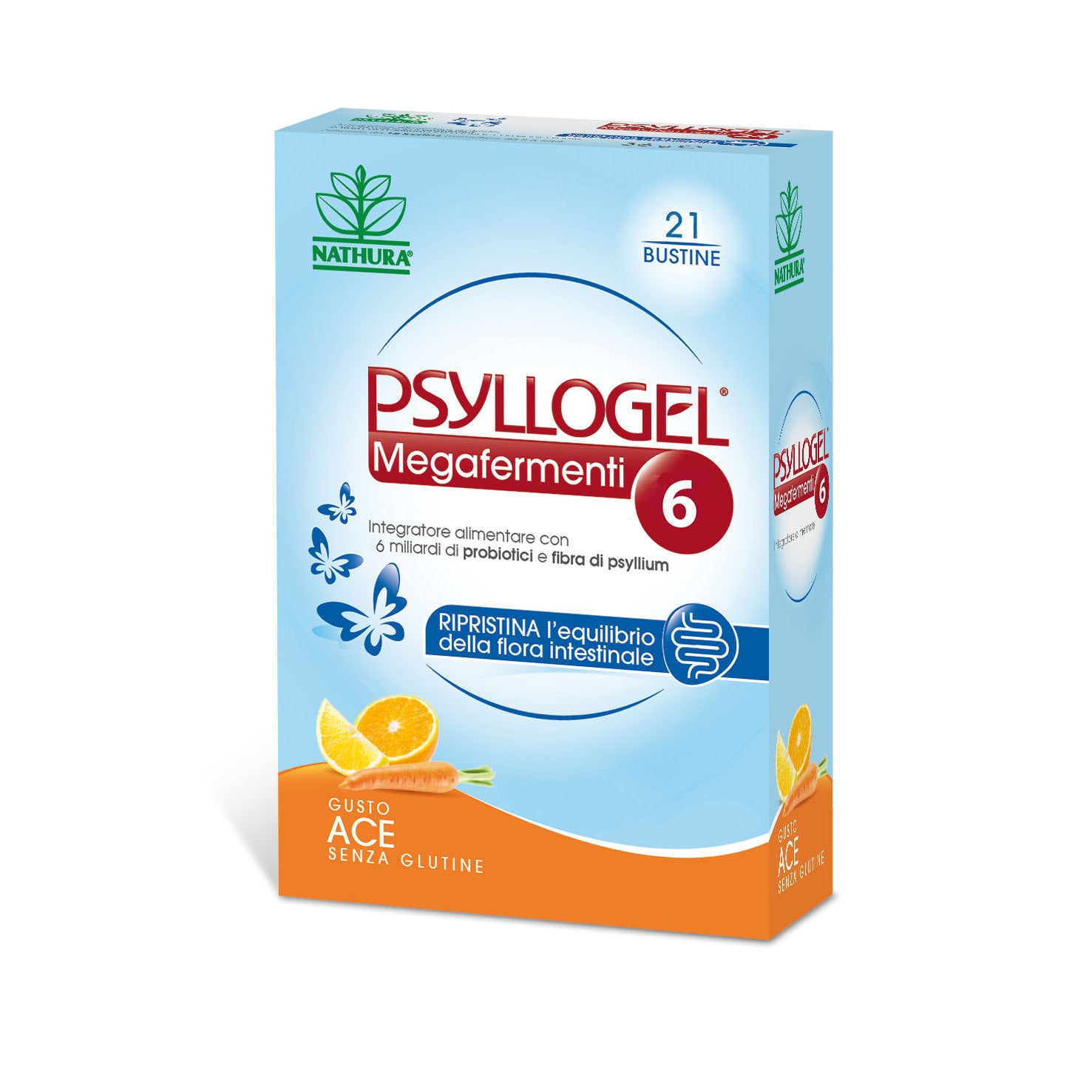 PSYLLOGEL MEGAFERMENTI 6 ACE Descrizione Integratore alimentare simbiotico con 6 miliardi di probiotici e fibra di psyllium pura al 99%, con edulcorante. Psyllogel Megafermenti 6 ? utile perch? favorisce l'equilibrio della flora batterica intestinale. La fibra di psyllium (Plantago ovata), invece, funge da nutrimento per la flora batterica intestinale, favorendone lo sviluppo. Inoltre, ha la caratteristica peculiare di formare, a contatto con l'acqua, un gel in grado di modulare la consistenza della massa fecale. Ingredienti Fibra di psyllium (Plantago ovata Forsk., tegumentum seminis) pura al 99%, aroma; emulsionante: lecitina; miscela di probiotici [Lactobacillus paracasei SD5275 (4 mld), Bifidobacterium animalis subsp. lactis SD5219 (1 mld), Lactobacillus acidophilus SD5221 (1 mld)]; agente antiagglomerante: biossido di silicio; acidificante: acido citrico; succo disidratato di arancio, carota e limone; colorante: beta-carotene; edulcorante: sucralosio. Senza glutine. Caratteristiche nutrizionali Valori medi per 100 g per 1 bustina da 2,8 g Energia 804 kJ 200 kcal 22,5 kJ 5,6 kcal Grassi di cui saturi 1,6 g 0,4 g 0 g 0 g Carboidrati di cui zuccheri 1,9 g 0,8 g 0,1 g 0 g Fibre 88 g 2,5 g Proteine 2,0 g 0,1 g Sale 0,24 g 0 g Modalit? d'uso Si consiglia di assumere da 1 a 4 bustine di Psyllogel Megafermenti 6 al giorno a seconda delle esigenze (per un consiglio consultare il medico o il farmacista), lontano dai pasti. Psyllogel Megafermenti deve essere assunto con adeguate quantita di acqua: versare il contenuto di una bustina in un bicchiere (150 ml), riempire di acqua naturale non gassata, mescolare bene per circa un minuto e quindi bere. Avvertenze Gli integratori non vanno intesi come sostituti di una dieta varia ed equilibrata e di uno stile di vita sano. Assumere il prodotto almeno due ore prima o due ore dopo l'assunzione di farmaci. Tenere fuori dalla portata dei bambini al di sotto dei tre anni. Non superare la dose giornaliera consigliata. Non contiene fonti di lattosio. Conservazione Conservare in luogo asciutto e a temperatura inferiore ai 25?C. Evitare gli sbalzi termici. Validit? a confezionamento integro: 24 mesi. Formato Astuccio da 21 bustine monodose da 2,8 g cad. Quantit? nominale: 58,8 g. Cod. 71147121