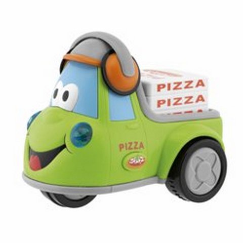 Camioncino con le cuffie musicali, che consegna le pizze.
