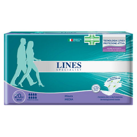 LINES SPECIALIST PANNOLONE A MUTANDINA MAXI MISURA MEDIA Descrizione Il pannolone a mutandina Lines Specialist Maxi misura media ? indicato per persone affette da incontinenza gravissima. Caratteristiche del prodotto: -Morbido e traspirante sulla pelle: il prodotto ? rivestito interamente di tessuto "tipo cotone" traspirante che aiuta a ridurre la sudorazione della pelle e a mantenerla fresca e asciutta. -Indicatore di cambio: sottili strisce di colore giallo visibili all'esterno del prodotto, che cambiano colore dal giallo all'azzurro segnalando quando ? opportuno cambiare il prodotto. -Lozione dermoprotettiva: esclusiva lozione lenitiva arricchita con aloe che, a contatto con la pelle crea una barriera protettiva, contribuendo a mantenere la pelle sana e asciutta, che aiuta a ridurre arrossamenti cutanei. L'azione protettiva e lenitiva ? dimostrata da test clinici. -Sistema controlla odore: all'interno del materassino assorbente dei prodotti ? presente il sistema "blocca e neutralizza odore" in grado di catturare le molecole di urina e neutralizzare il cattivo odore. -Barriere laterali anti-fuoriuscite: posizionate sul telino a contatto sulla pelle, si adattano al corpo riducendo il rischio di fuoriuscite. -Filtrante assorbi rapido: cattura velocemente il liquido tenendolo lontano dalla pelle. -Etichette riposizionabili: etichette in velcro riposizionabili pi? e pi? volte, aiutano a garantire la tenuta. Lines Specialist Maxi assicura la massima assorbenza e la massima protezione della pelle. Tutti i prodotti Lines Specialist sono latex free e non ? presente lattice nel materiale di confezionamento primario, nonch? nel materiale usato nei processi di produzione. Modalit? d'uso Per un montaggio efficace, si raccomanda di centrare il prodotto sulla pancia allineando il davanti e il dietro dello stesso. Attenzione alla giusta taglia poich?, se un utente dovesse indossare una taglia troppo grande per le sue esigenze, si creerebbero degli spazi tra il prodotto ed il corpo per cui ? probabile che il liquido fuoriesca. Formato Misura: media. Circonferenza vita da 70 e 110 cm (consigliato per una taglia 42-46). Confezione contenente 20 pezzi. Cod. 2705736 [EAN: 8001480016194]