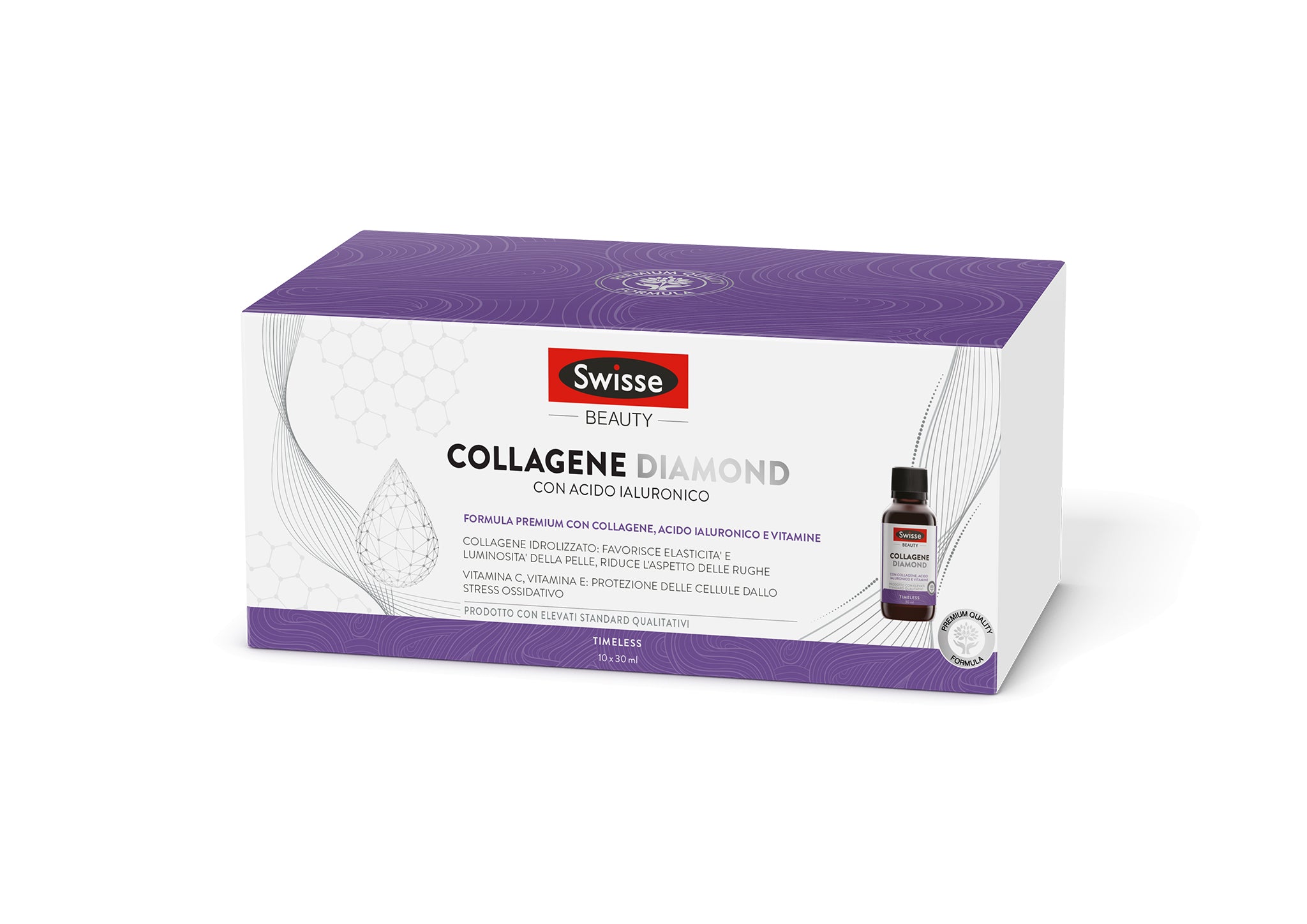 SWISSE COLLAGENE DIAMOND e' un integratore alimentare a base di collagene, acido ialuronico, vitamine e minerali.