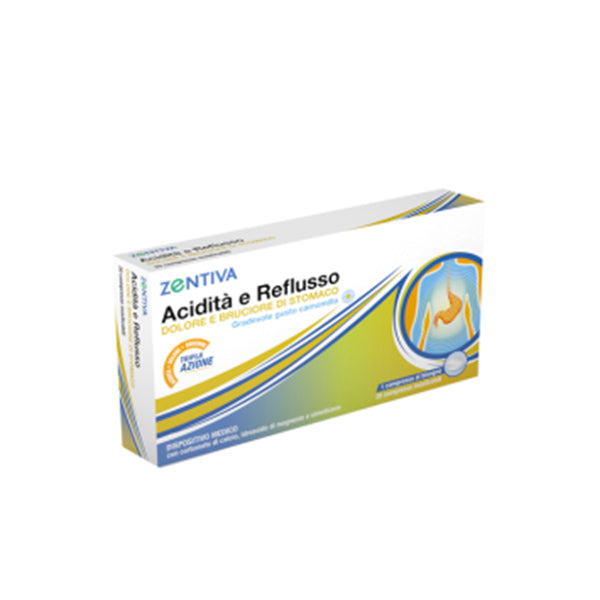 ZENTIVA ACIDITÀ E REFLUSSO è indicato nel trattamento di dolore e bruciore allo stomaco causati dall’eccesso di acidità e nel trattamento dei sintomi associati al reflusso gastroesofageo. È utile anche in caso di difficoltà di digestione, bruciore e pesantezza (sintomi associati alla dispepsia).