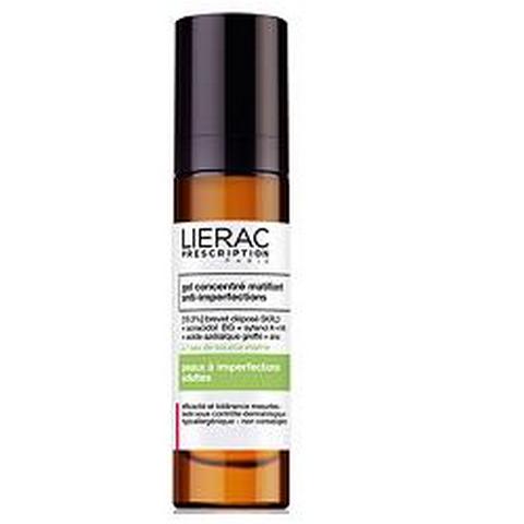 LIERAC PRESCRIPTION gel concentré matifiant anti-imperfections Gel fresco, leggero e non grasso, ideale per le imperfezioni cutane pelle adulta, per ridurre anche le imperfezioni più difficili, opacizzare e idratare la pelle. Trattamento testato sotto controllo dermatologico. Ipoallergenico e non comedogeno. Senza parabeni, senza coloranti. Profumo senza allergeni. Modalità d'uso Applicare mattina e/o sera, sul viso, evitando il contorno occhi. Componenti SKRL3 (acqua di sorgente marina, prebiotico, zucchero biotecnologico captatore d'acqua) 18,3%; acnacidol BG; sytenol A; idrossiacidi (acido salicilico, acido glicolico, acido lattico) (10%); complesso di acido azelaico; zinco; polveri assorbenti. Formato 50 ml. Cod. L281V02 [EAN: 3508240202811]