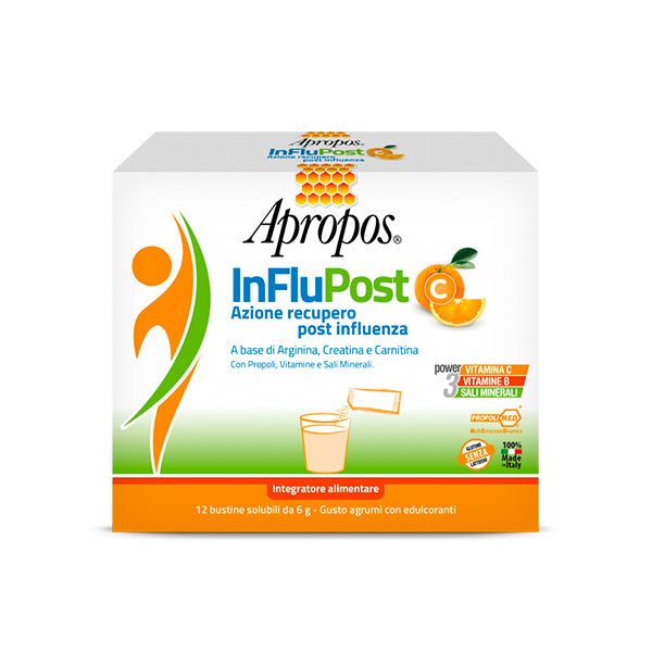 Apropos InFluPost C Azione recupero post influenza è un integratore alimentare a base di Arginina, Creatina e Carnitina con estratti di Propoli*, Vitamina C, Vitamine del Gruppo B e Sali Minerali per il recupero dai sintomi di affaticamento e carenza di energia, in seguito a periodi influenzali e raffreddore. *PROPOLI M.E.D.®: la propoli utilizzata per i prodotti Apropos é ottenuta con la Multi estrazione Dinamica, una metodologia estrattiva che offre un’elevata presenza di Flavonoidi e di Polifenoli.