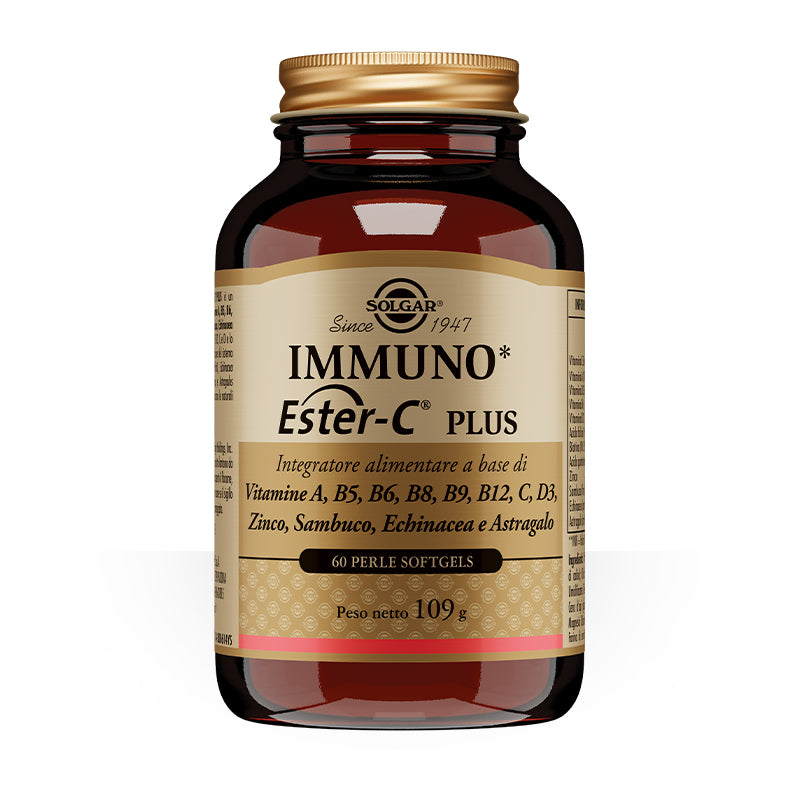 IMMUNO ESTER-C PLUS è un integratore alimentare a base di Vitamine A, B5, B6, B8, B9, B12, C**, D3, Zinco, Sambuco, Echinacea e Astragalo. Le vitamine A, B6, B9, B12, C e D e lo zinco contribuiscono alla normale funzione del sistema immunitario. Sambucus nigra L. (frutti), Echinacea purpurea (L.) Moench (parte aerea) e Astragalus membranaceus Moench (radice) favoriscono le naturali difese dell’organismo. L’acido pantotenico (B5), la vitamina B6, l’acido folico (B9), la vitamina B12 e la vitamina C contribuiscono alla riduzione della stanchezza e dell’affaticamento. Insieme alla biotina (B8), le vitamine B5, B6, B12 e C contribuiscono al normale metabolismo energetico. La vitamina A contribuisce al mantenimento di pelle e membrane mucose normali.