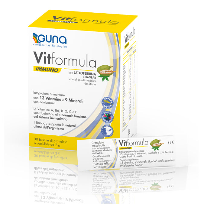 Vitformula IMMUNO nasce dalla ricerca in Nutraceutica Fisiologica Guna, con componenti nutrizionali selezionati e mirati, utili in caso di aumentato fabbisogno o di diminuito apporto alimentare. Contiene:
