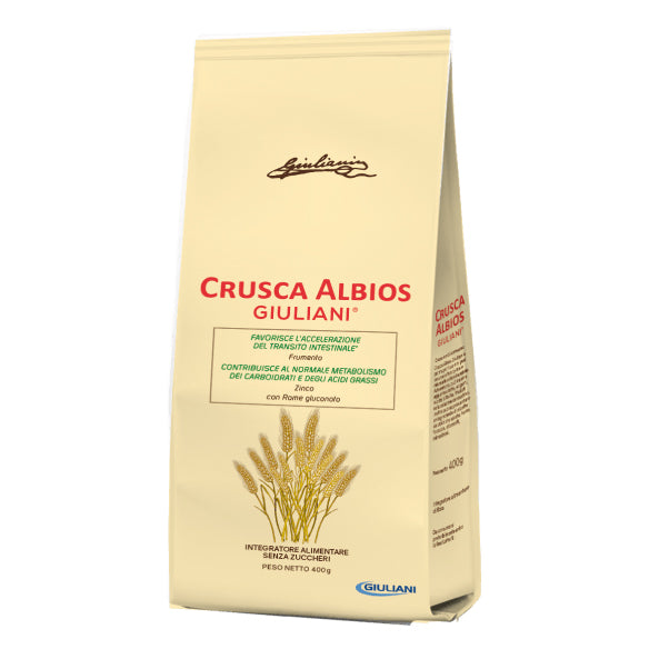 GIULIANI ALBIOS CRUSCA Formato Confezione da 400 g Indicazioni Integratore ad altissima concentrazione di fibre, indicato nei casi di scarso apporto di fibra con la dieta e conseguente rallentamento del transito intestinale. Posologia e Modalità d'uso Assumere 4 cucchiai al giorno. Il prodotto può essere assunto tal quale o miscelato a cibi o bevande. È consigliabile inoltre un consumo abbondante d'acqua nel corso della giornata. Caratteristiche La fibra alimentare aumenta il volume del contenuto intestinale e quindi la velocità di transito. Può essere utile per favorire la regolarità intestinale. L'integrazione di fibra può altresì essere utile nelle diete ipocaloriche, per la riduzione del peso, purché controllate. Componenti Contiene crusca dietetica di frumento; zinco; rame.