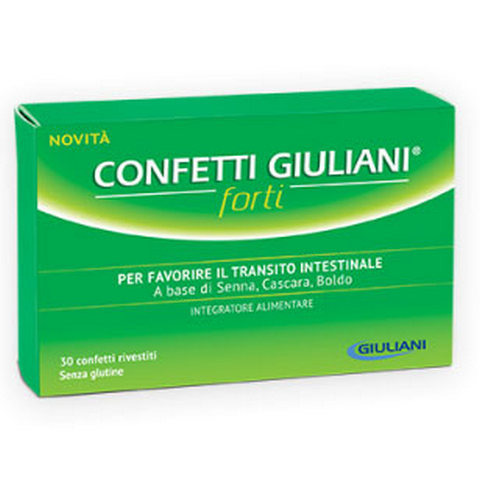 CONFETTI GIULIANI FORTI Formato Confezione da 30 confetti rivestiti. Integratore alimentare che favorisce la motilità intestinale grazie alla presenza degli estratti naturali di senna, cascara e boldo, utili per la salute dell' intestino. Senza glutine. Modo d'uso Per favorire la regolarità del transito intestinale è sufficiente una compressa al giorno, preferibilmente la sera: è consigliabile assumerla dopo il pasto serale, affinché l’effetto sera-mattina si produca dopo 8-12 ore, senza disturbare il sonno.