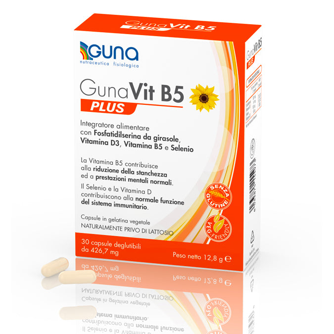 GunaVit B5 PLUS con Fosfatidilserina da girasole, a base di componenti nutrizionali selezionati e mirati, utili in caso di aumentato fabbisogno o di diminuito apporto alimentare, nasce dalla ricerca di Nutraceutica Fisiologica Guna. In particolare: