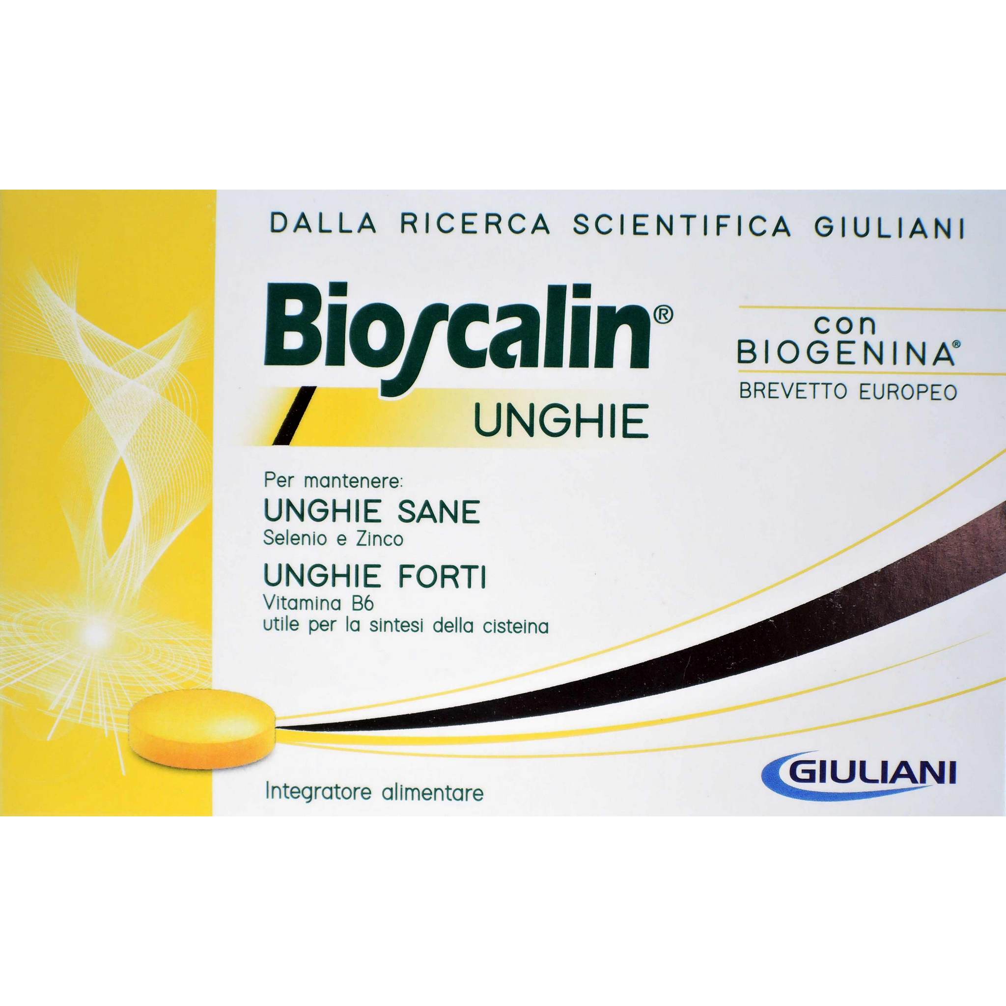BIOSCALIN UNGHIE Bioscalin Unghie è un integratore a rilascio prolungato, la cui formula è stata studiata tenendo conto dei fattori principali che agiscono sulle unghie. Oltre a Biogenina (brevetto europeo) e Dimetilsolfone (forma organica dello zolfo, minerale presente nelle unghie), la formulazione di Bioscalin Unghie è ricca di altri preziosi micronutrienti specifici: - Zinco e Selenio contribuiscono al mantenimento di unghie normali - Vitamina C, E, Manganese e Rame proteggono le cellule dallo stress ossidativo, responsabile dellindebolimento delle unghie - Vitamina B6 aiuta la funzionale sintesi della Cisteina, costituente della Cheratina, la principale componente dell'unghia L'assorbimento graduale degli attivi presenti allinterno delle compresse di Bioscalin Unghie è reso possibile dalla Tecnologia Retard che consente, con una sola somministrazione al giorno, un rilascio costante e prolungato nel tempo (circa 8-12 ore) dei componenti, al fine di ottimizzarne l'assorbimento. Si consiglia di assumere il prodotto quando le unghie appaiono deboli, fragili, facili a spezzarsi e di aspetto opaco, condizioni spesso conseguenti a carenze nutrizionali. Modo d'uso 1 compressa al giorno, preferibilmente con la colazione del mattino o al pasto principale. Si consiglia un ciclo di trattamento di almeno 2 mesi, da ripetersi al bisogno. Formato Confezione da 30 compresse